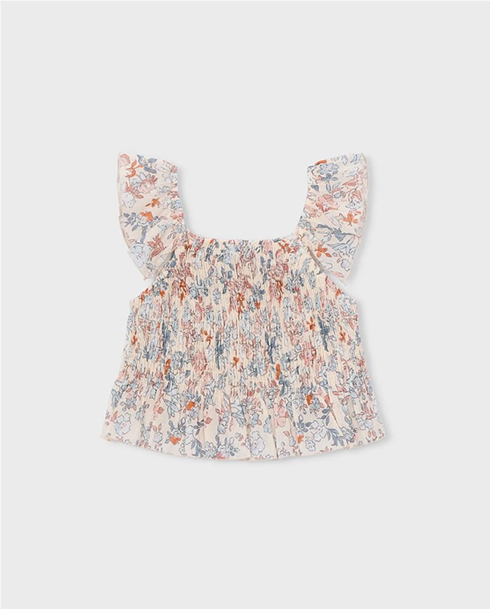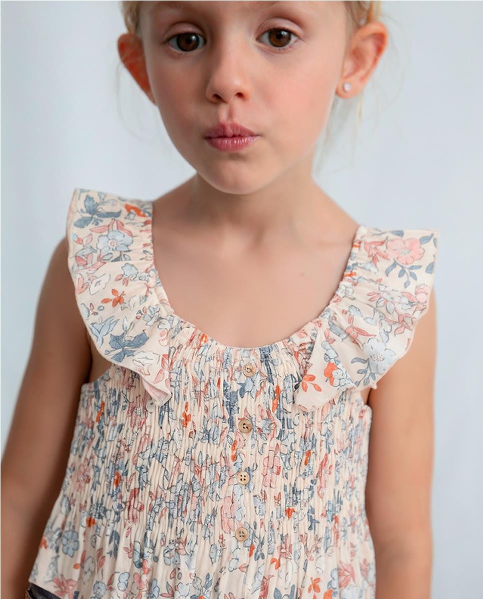 Top de tirantes en bambula. Estampado y con un acabado fruncido.