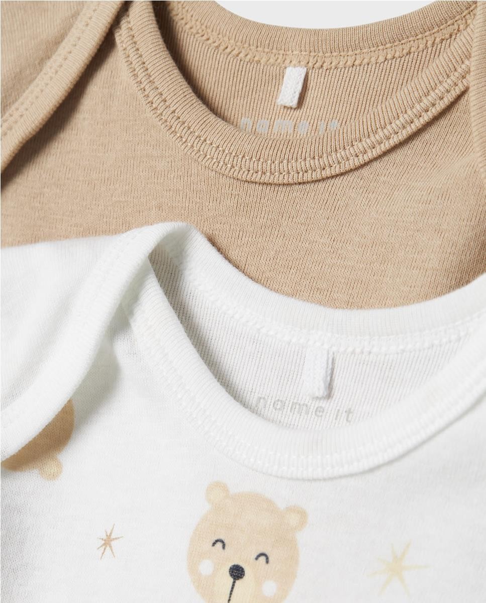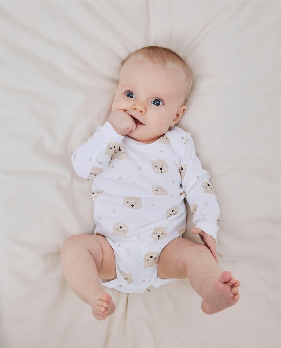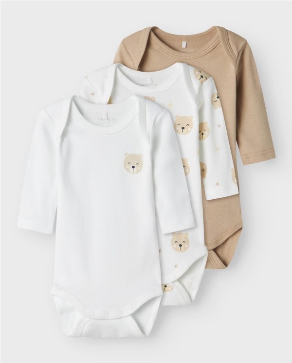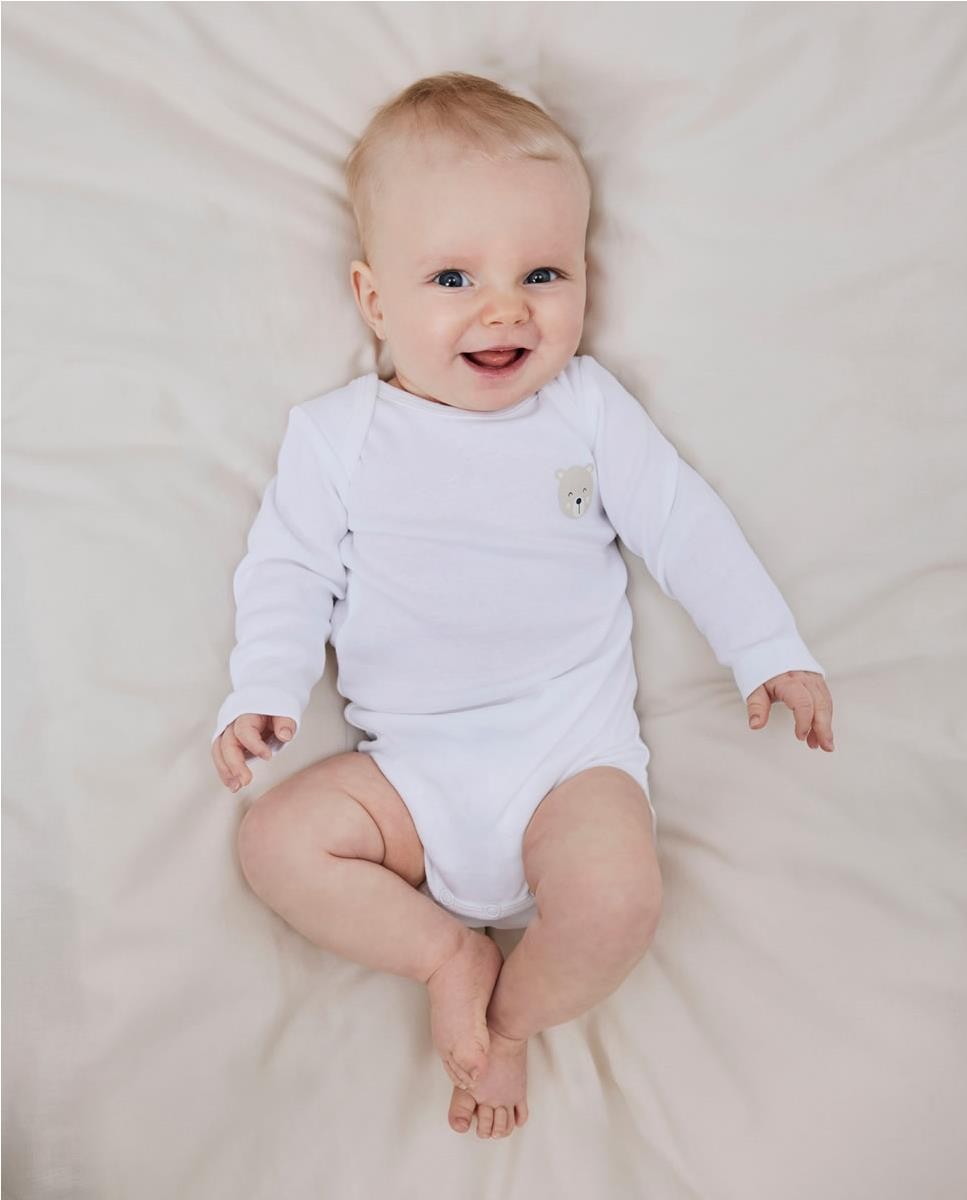 Pack de 3 bodys manga larga con algodón orgánico. Cuello con escote americano. Cierre con corchetes en la entrepierna.