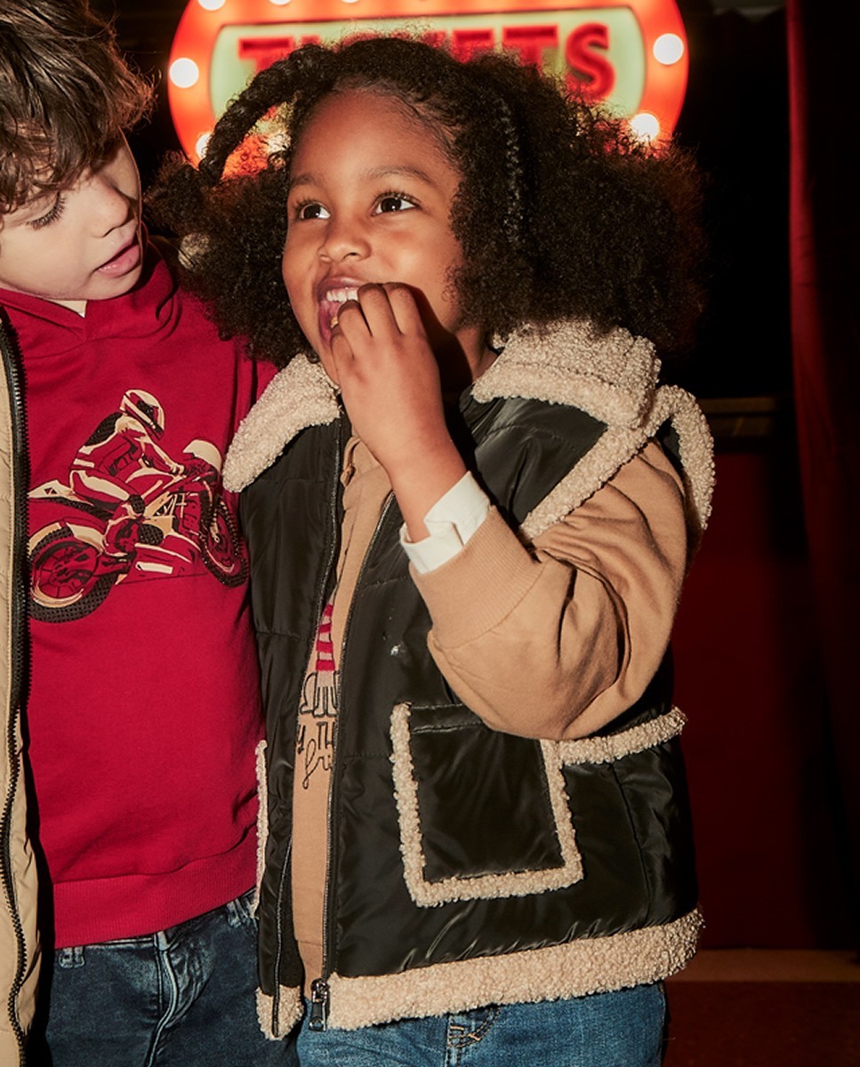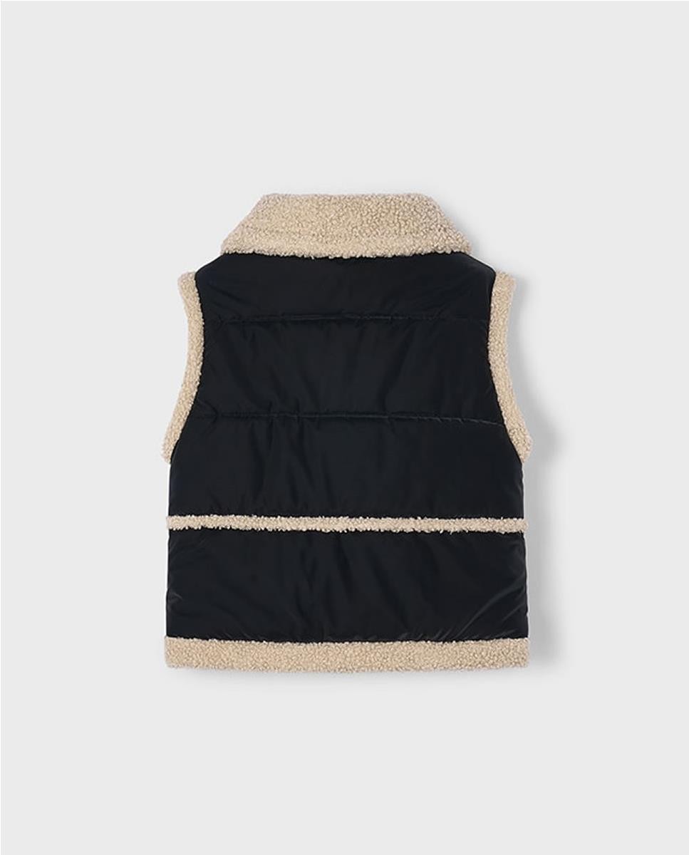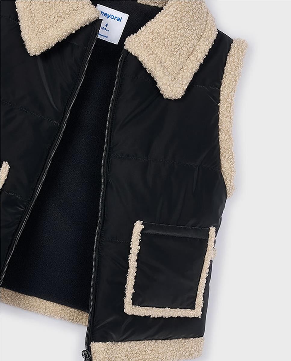 Chaleco con cuello de pelo. Cierre central delantero con cremallera. Exterior textil con efecto acolchado. Forro interior combinado con borrego. Bolsillos funcionales en la parte delantera.