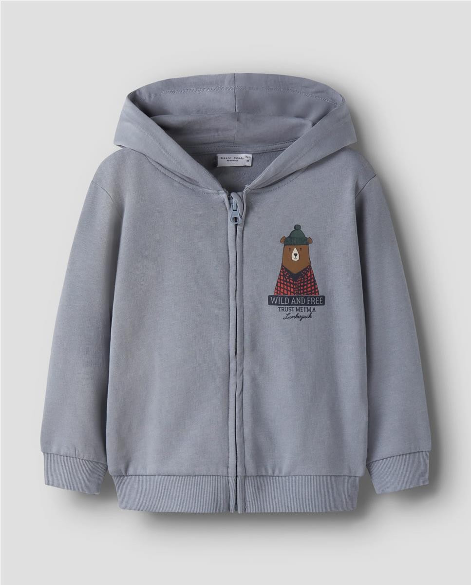 Chaqueta de felpa con cremallera y capucha. Algodón orgánico. Motivos print: Montain.