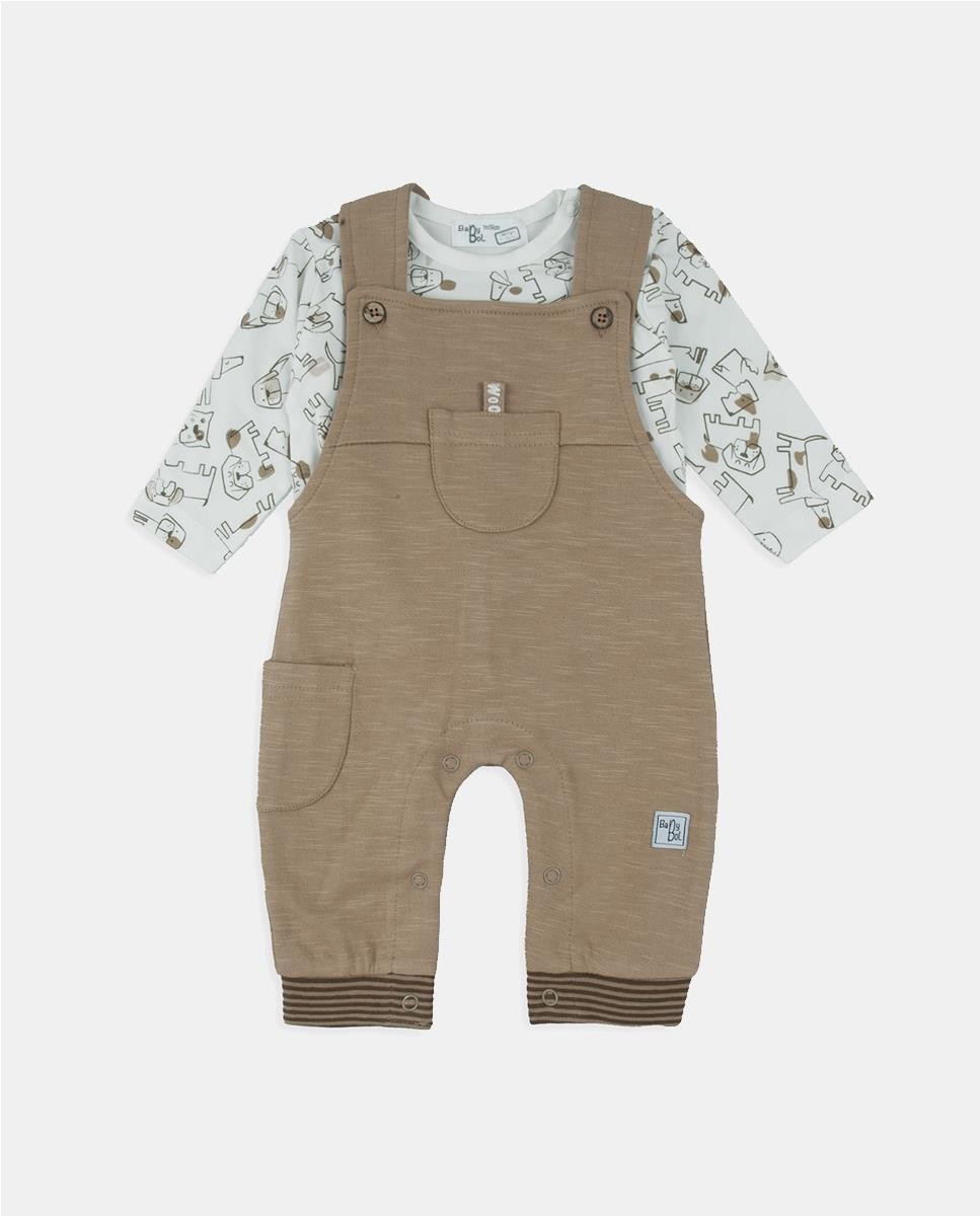 Conjunto en tejido de algodón, que combina peto en color liso con bolsillos y camiseta de manga larga estampada con perritos.