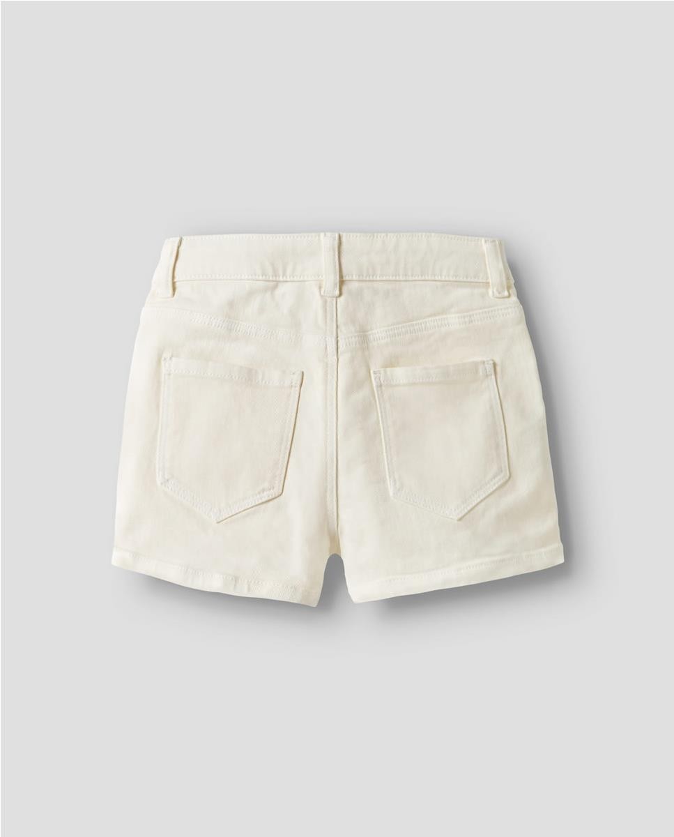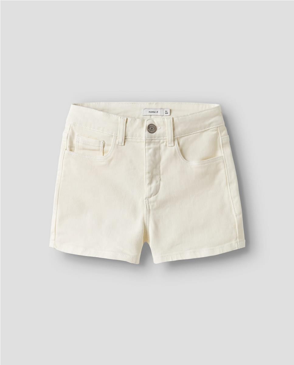Short de sarga básico. Cierre con botón de gancho y cremallera. Cintura ajustable.