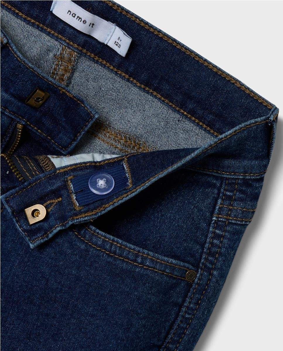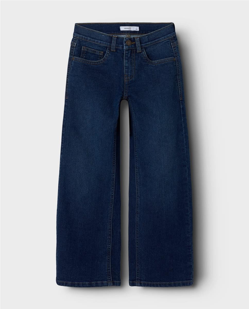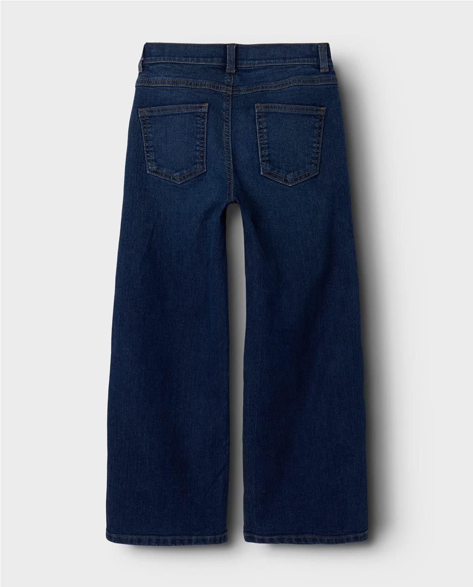 Pantalón tejano de corte ancho. Cierre con botón de gancho. Cintura media con ajustables. Acabado con un desgaste sutil.