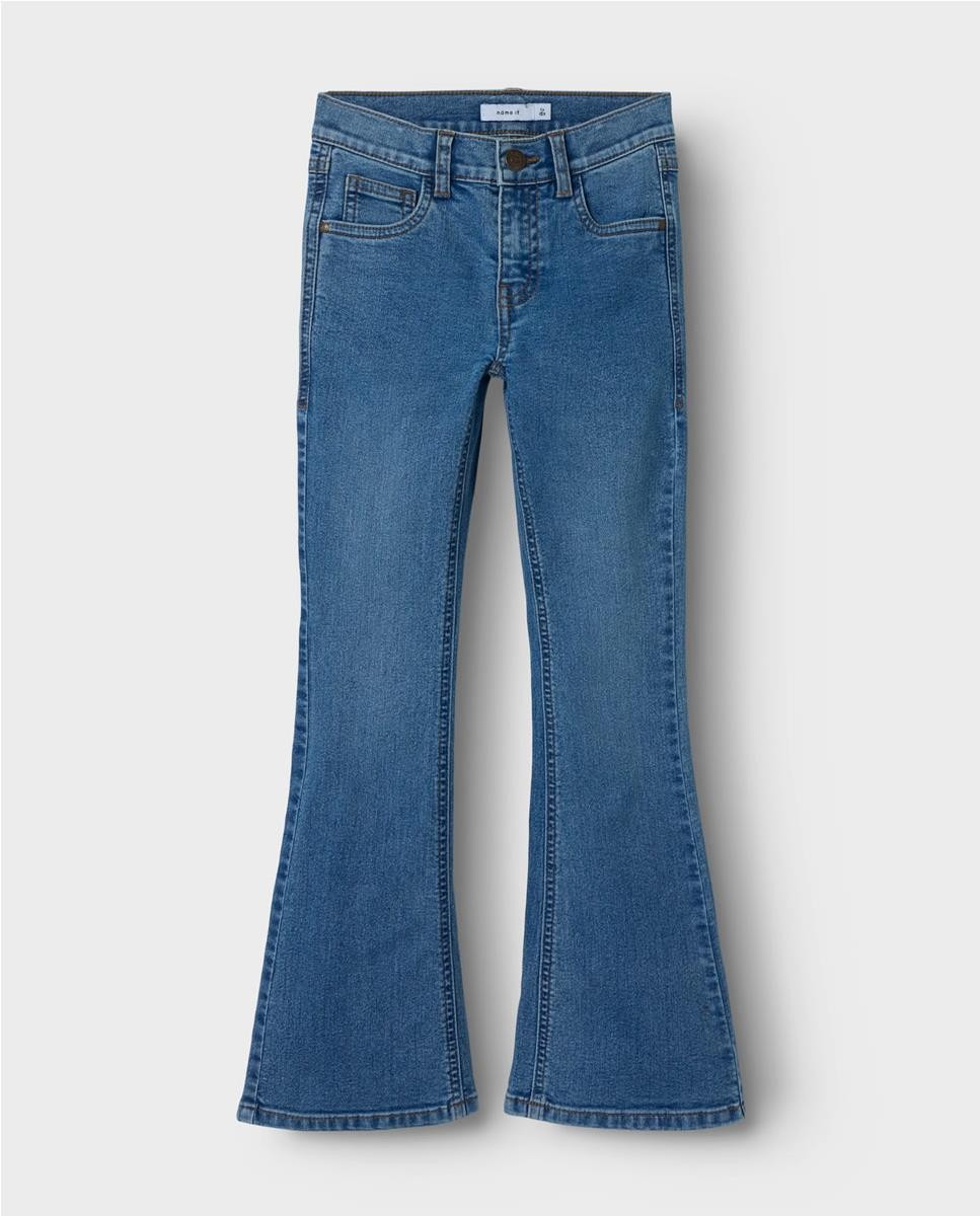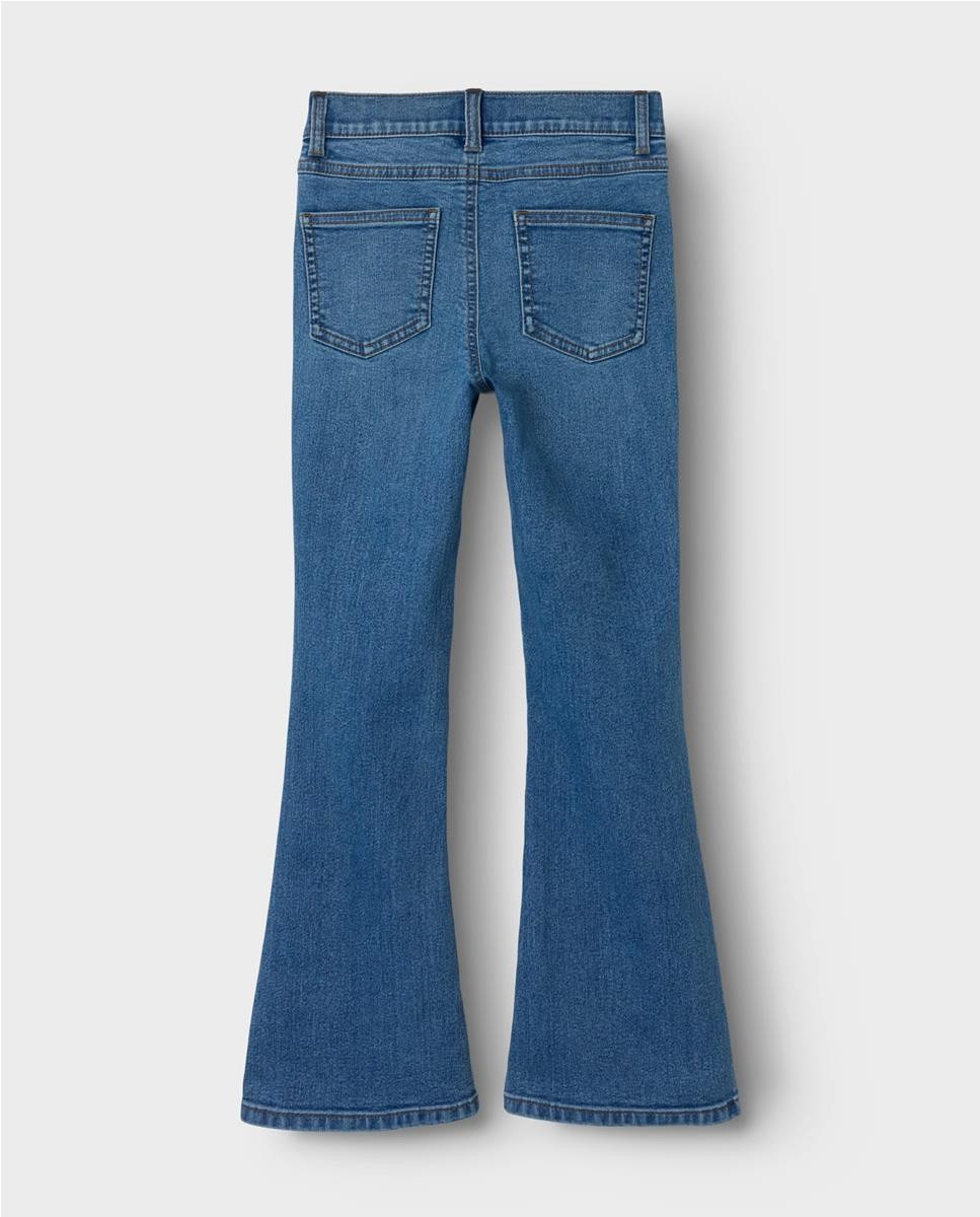 Pantalón tejano de corte acampanado. Cintura ajustable y cierre con botón de gancho. Acabado con un desgaste sutil.