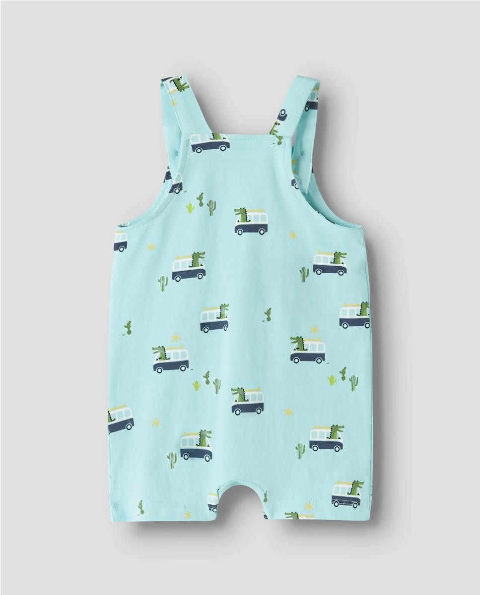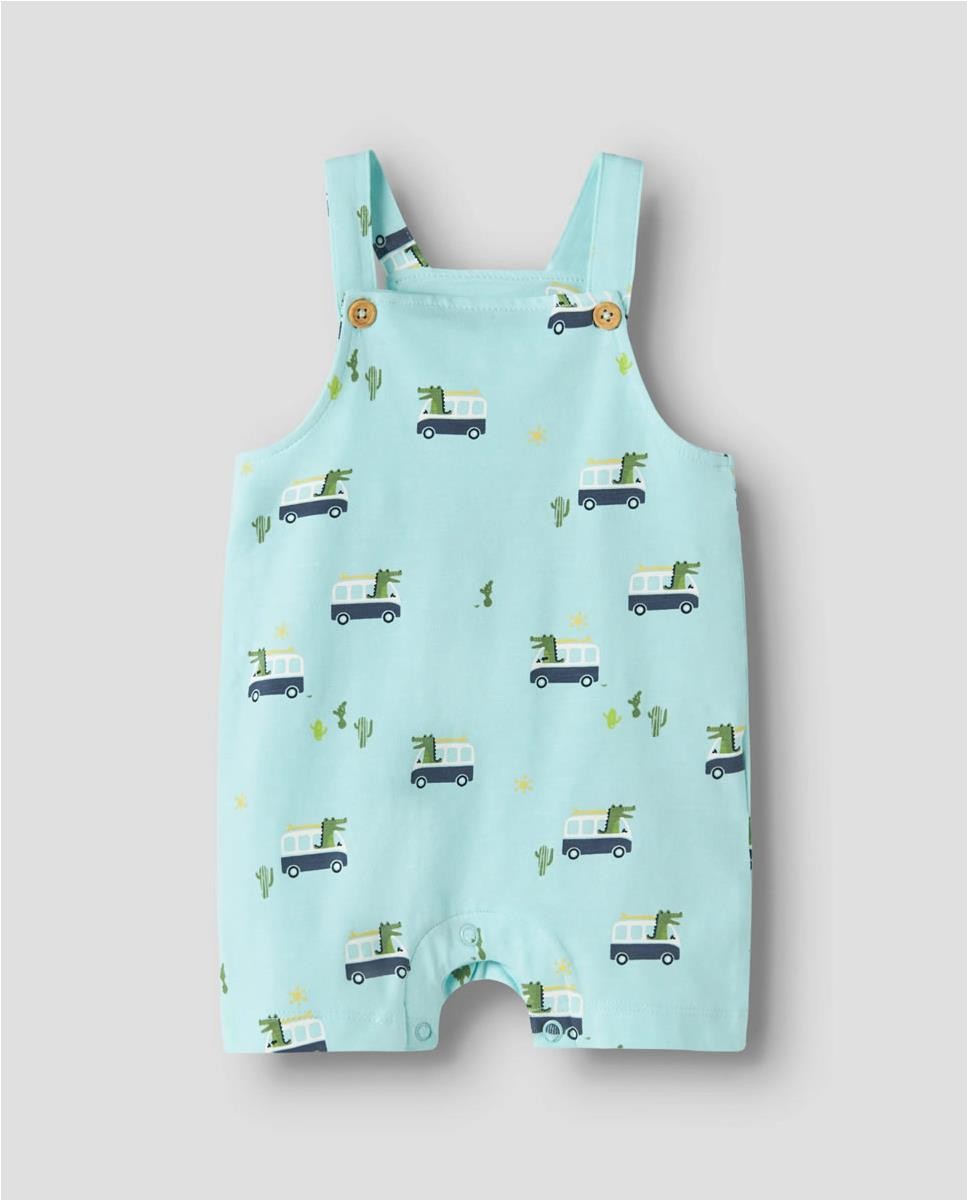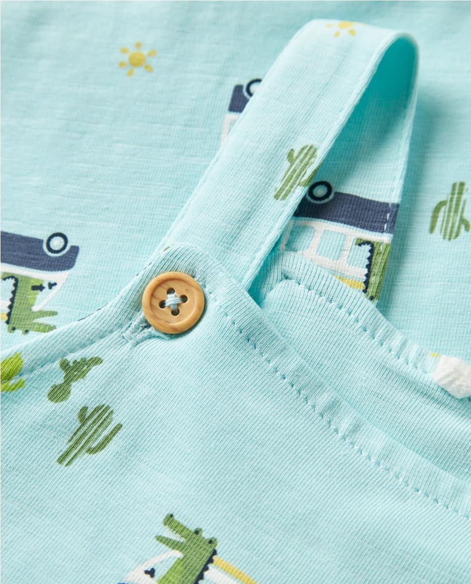 Peto de punto estampado. Cierre en los tirantes con botones de madera. Abertura con corchetes ideal para el cambio de pañal.