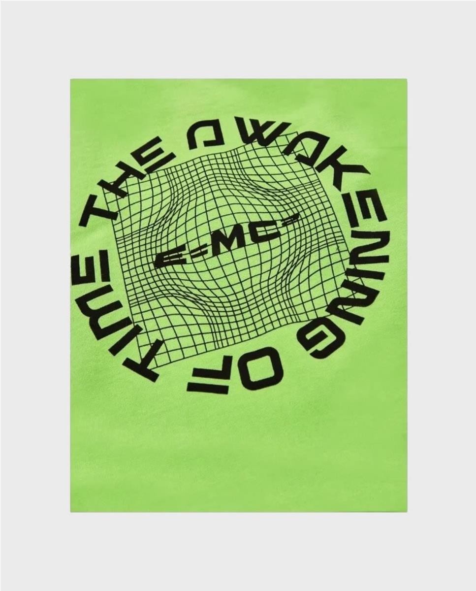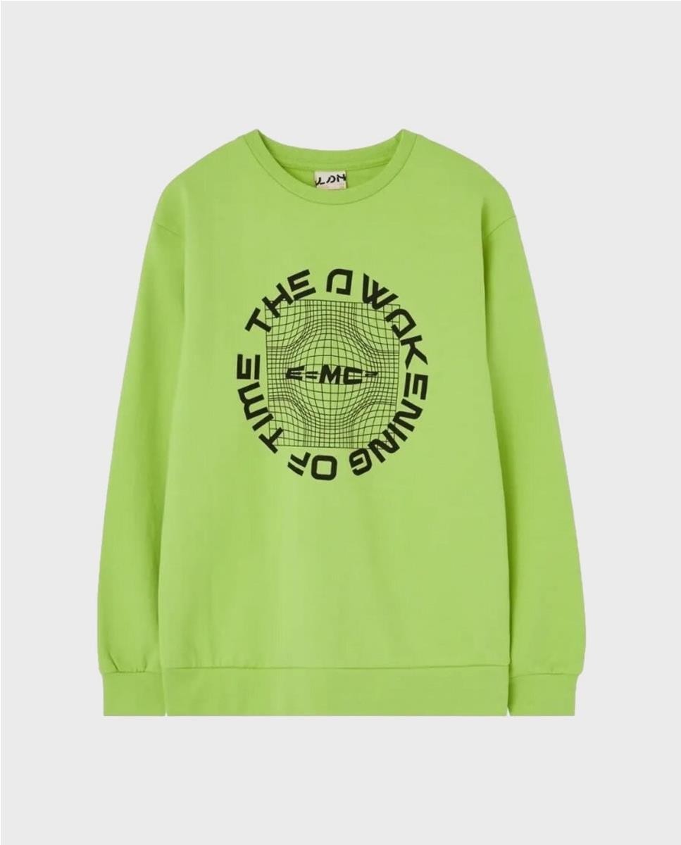 Sudadera chico con cuello redondoy un grafico central.Alrededor del globo, se encuentra la frase "THE AWAKENING OF TIME" en un arreglo circular, y en el centro, la famosa ecuación "E=MC2".