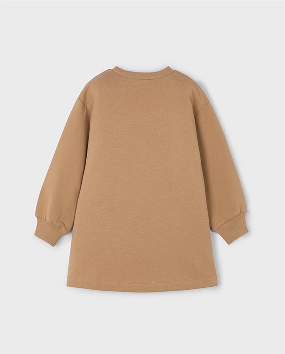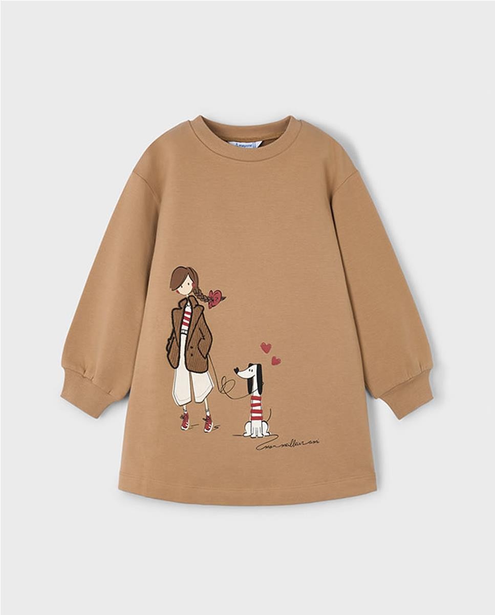 Vestido de manga larga con puños elásticos. Cuello redondo. Suave tejido de algodón elástico. Elementos de adorno: serigrafía print con relieve.