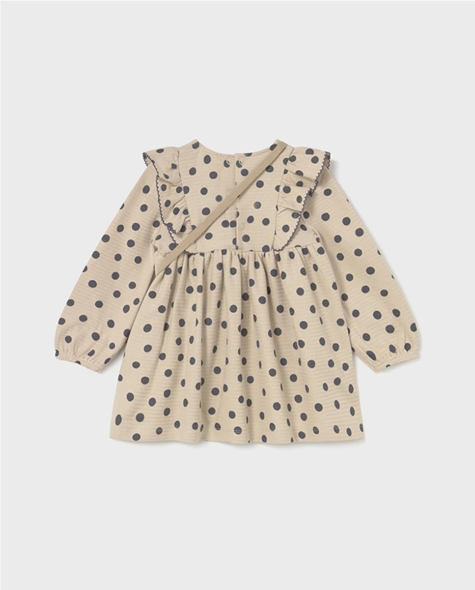 Original set de dos piezas, compuesto por un bolso en forma de gato y vestido de manga larga con puños elásticos. Cuello redondo. Cierre con botones a presión en la parte posterior. Modelo con rizo y volantes. Estampado en topos.
